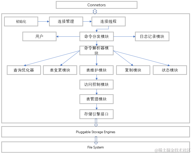负责监听对客户端向MySQL Server端的各种请求,接收请求,转发请求到目标模块。每个成功连接MySQL Server的客户请求都会被创建或分配一个线程,该线程负责客户端与MySQL Server端的通信,接收客户端发送的命令,传递服务端的结果信息等。