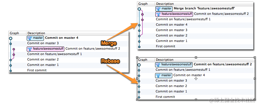 - 采用merge和rebase后,git log的区别,merge命令不会保留merge的分支的commit: