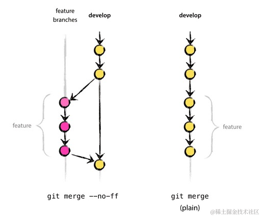 git merge 则不会显示 feature,只保留单条分支记录。\