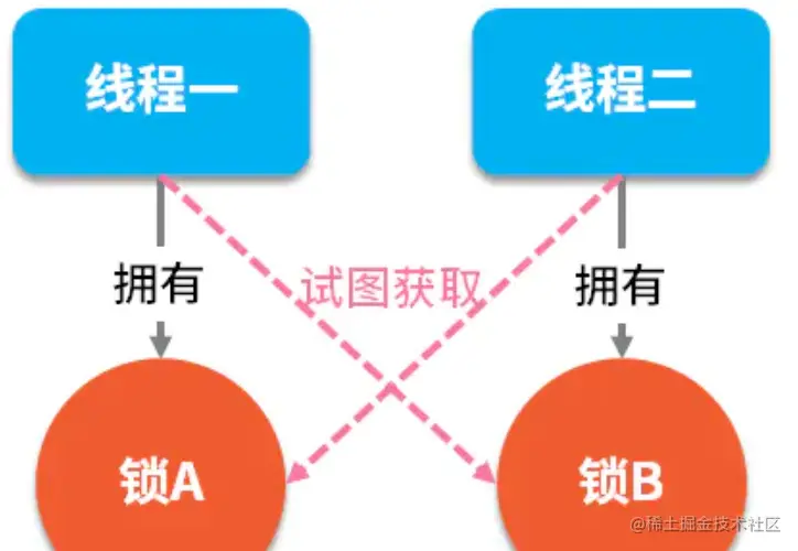 如下图所示,线程 A 持有资源 2,线程 B 持有资源 1,他们同时都想申请对方的资源,所以这两个线程就会互相等待而进入死锁状态