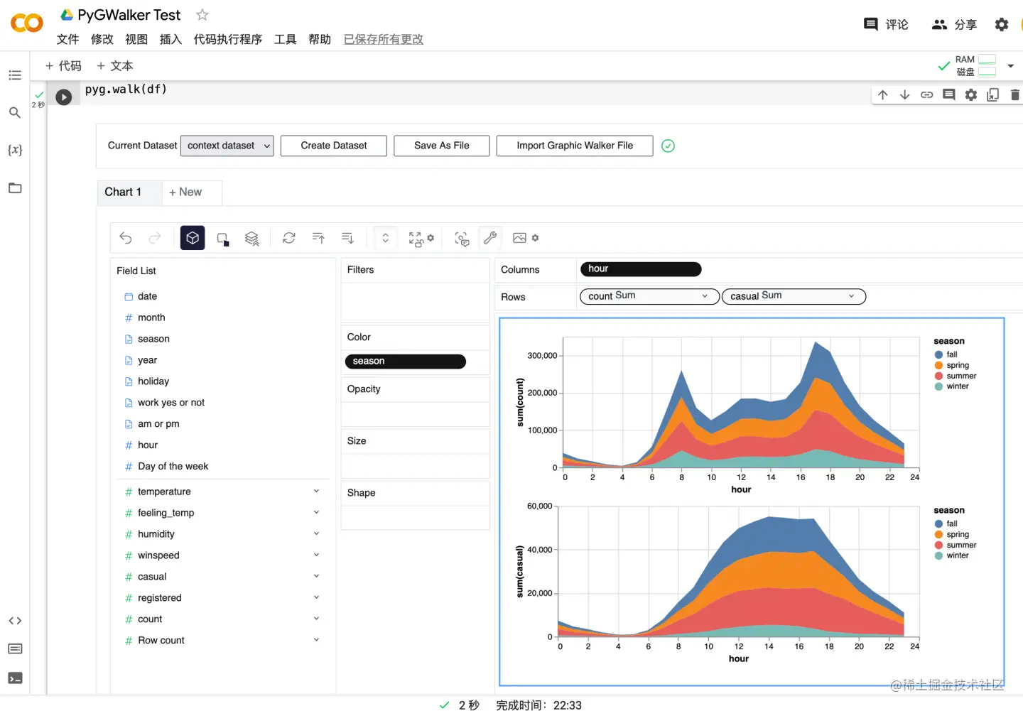 接下来,创建一个dataframe,只需调用pyg.walk方法,即可将datafame转化为一个可交互的可视化分析工具。