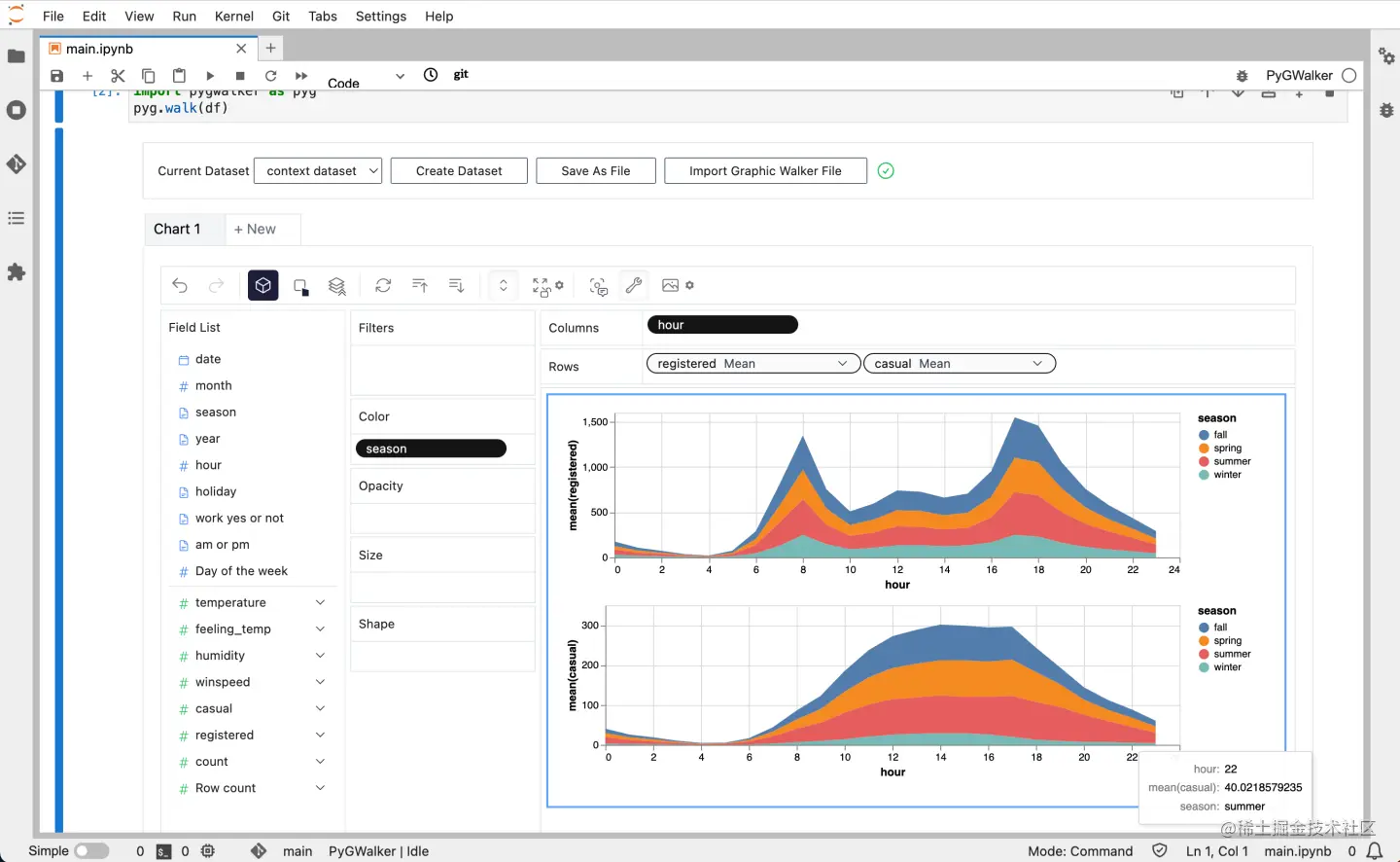 PyGWalker用于简化Jupyter Notebook工作流。无需复杂的数据分析和数据可视化步骤,您可以使用PyGWalker把 pandas dataframe 转化为可交互的图形界面进行分析。想象一下:在Jupyter Notebook 中跑起来一个类Tableau/PowerBI风格的界面,通过简单的拖放操作,就可以完成数据分析和可视化的操作。