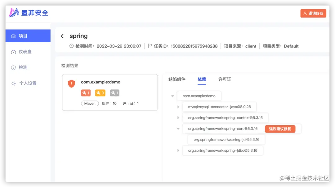 以上几种检测方式均可在墨菲安全平台上查看详细的检测结果,并可以查看项目的直接或间接依赖信息。