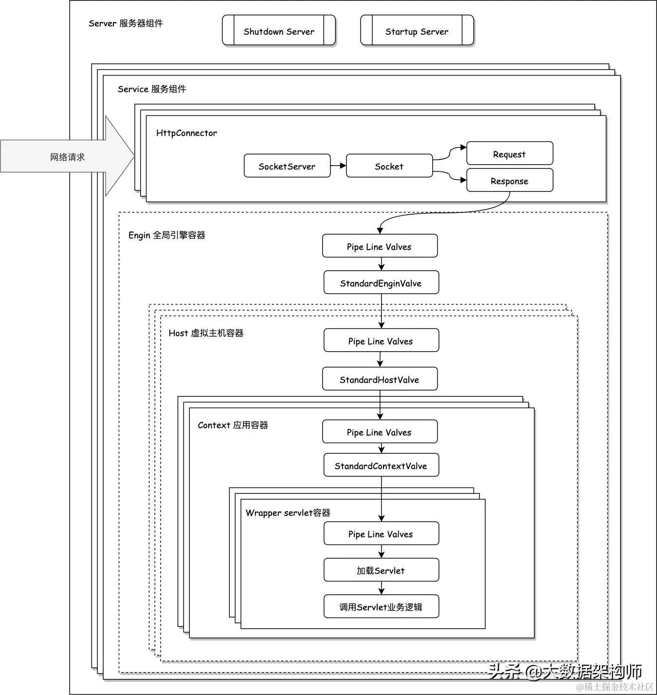 Servlet用于从某个Socket接收数据,并处理为标准的ServletRequest和ServletResponse。其内部逻辑比较复杂,我在关于Tomcat容器的其它系列文章中有详细的介绍Tomcat的结构,此处只简单列举一下其功能: