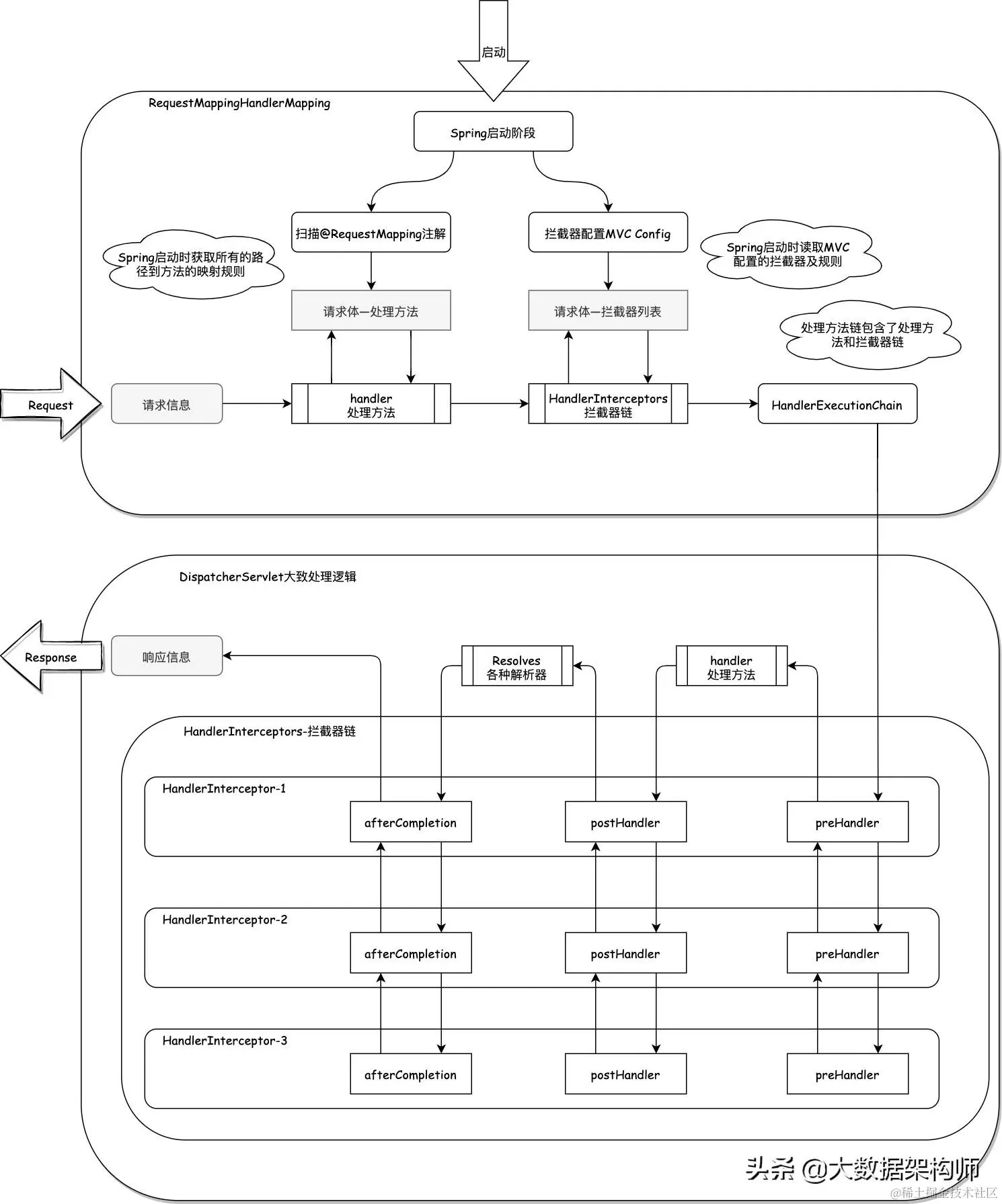RequestMappingHandlerMapping,从名称上可以看出来这个HandlerMapping是用于处理@RequestMapping注解请求映射的类。该类的工作原理如下所示,可以看到该类的主要作用是在收到请求之后,按顺序拿到所有需要调用的方法(主要包含拦截器和处理方法),然后一一调用这些方法。