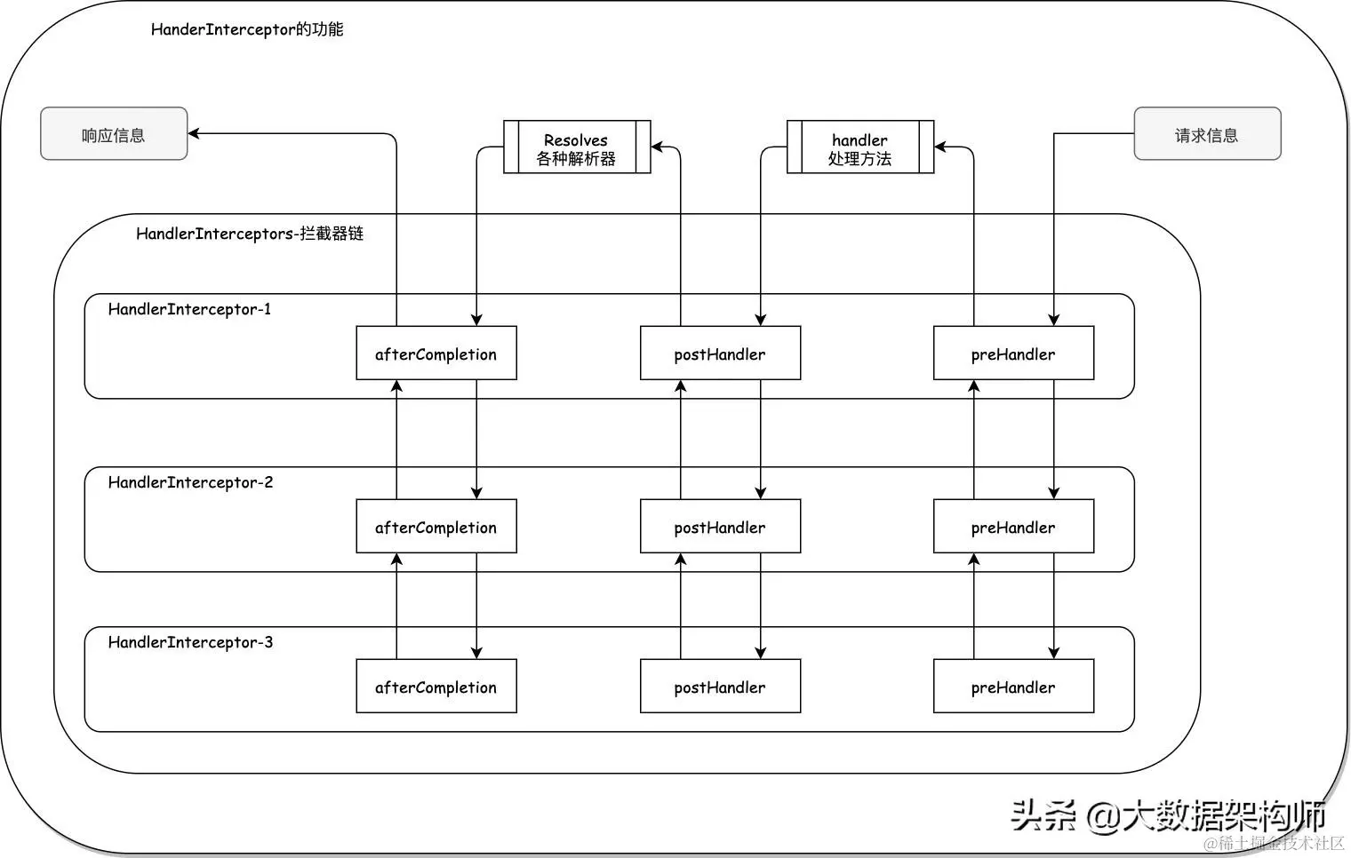 拦截器和Tomcat容器中的Valve有些类似,Spring的拦截器可以让用户灵活的在请求处理前、请求处理后和请求完成三个阶段自定义操作,比如用户权限校验等。拦截器的作用我们可以在上一节的图中看到,Spring关于拦截器的接口定义如下所示: