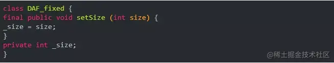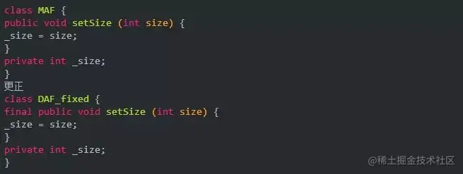 如:让访问实例内变量的 getter/setter 方法变成 ”final”: