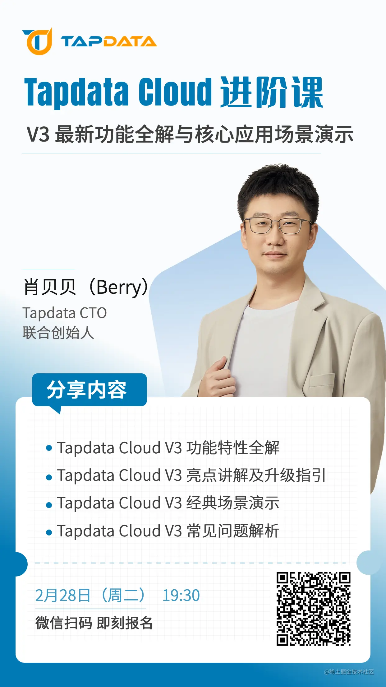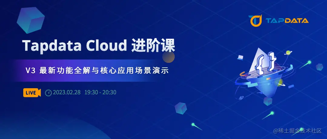 2月28日(周二)19:30,Tapdata 直播间与您相约。Tapdata CTO 肖贝贝(Berry)在线讲解 Tapdata Cloud V3 的全谱系功能特性,辅以版本对比与经典场景演示,为大家送上最全面的版本升级指南。