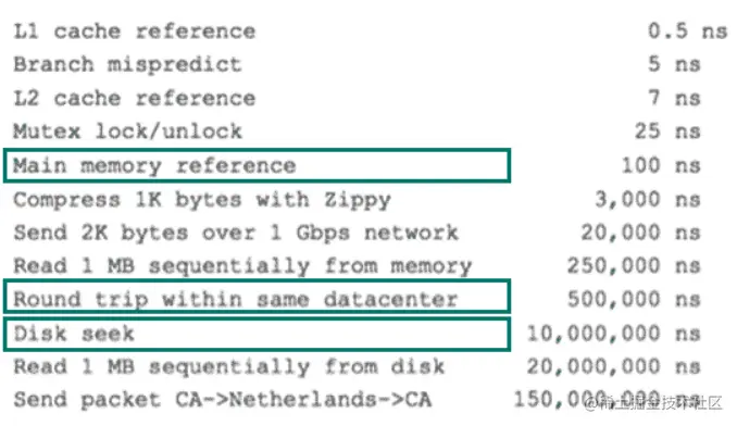 磁盘读取数据靠的是机械运动,每次读取数据花费的时间可以分为寻道时间、旋转延迟、传输时间三个部分,寻道时间指的是磁臂移动到指定磁道所需要的时间,主流磁盘一般在5ms以下;旋转延迟就是我们经常听说的磁盘转速,比如一个磁盘7200转,表示每分钟能转7200次,也就是说1秒钟能转120次,旋转延迟就是1/120/2 = 4.17ms;传输时间指的是从磁盘读出或将数据写入磁盘的时间,一般在零点几毫秒,相对于前两个时间可以忽略不计。那么访问一次磁盘的时间,即一次磁盘IO的时间约等于5+4.17 = 9ms左右,听起来还挺不错的,但要知道一台500 -MIPS的机器每秒可以执行5亿条指令,因为指令依靠的是电的性质,换句话说执行一次IO的时间可以执行40万条指令,数据库动辄十万百万乃至千万级数据,每次9毫秒的时间,显然是个灾难。下图是计算机硬件延迟的对比图,供大家参考: