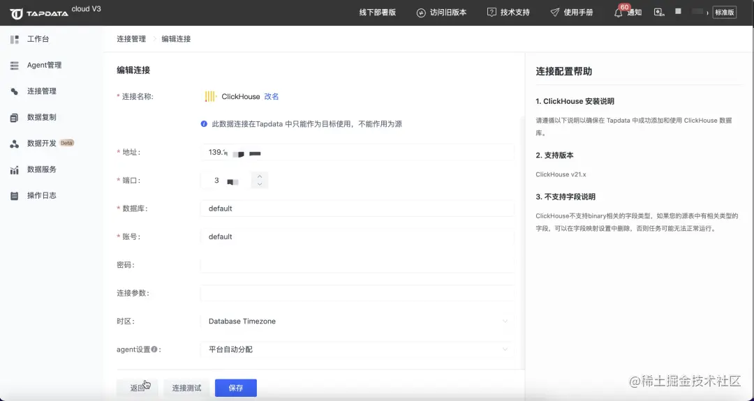 ③ 创建数据目标 ClickHouse 的连接