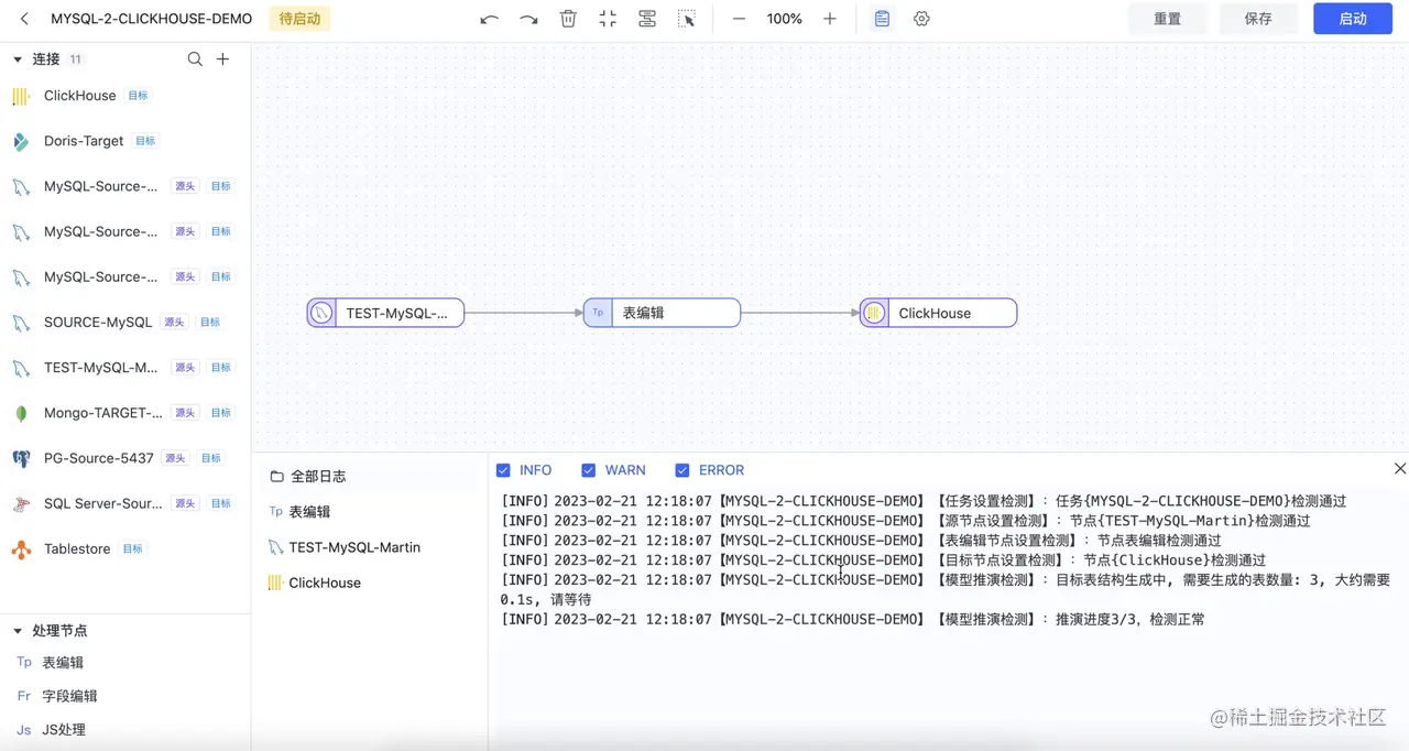 借助 Tapdata 出色的实时数据能力和广泛的数据源支持,可以在几分钟内完成从源库到 ClickHouse 包括全量、增量等在内的多重数据同步任务。
