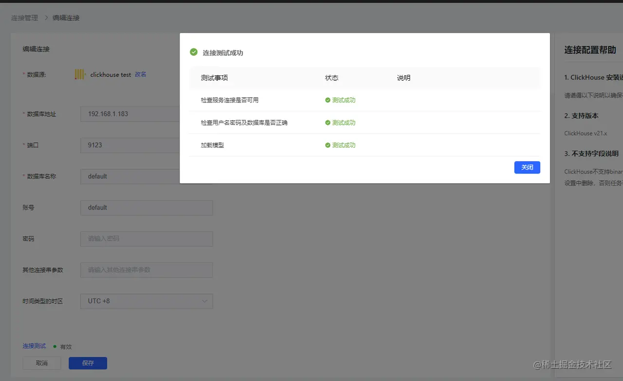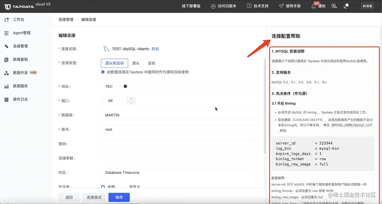 参考右侧【连接配置帮助】,完成连接创建: