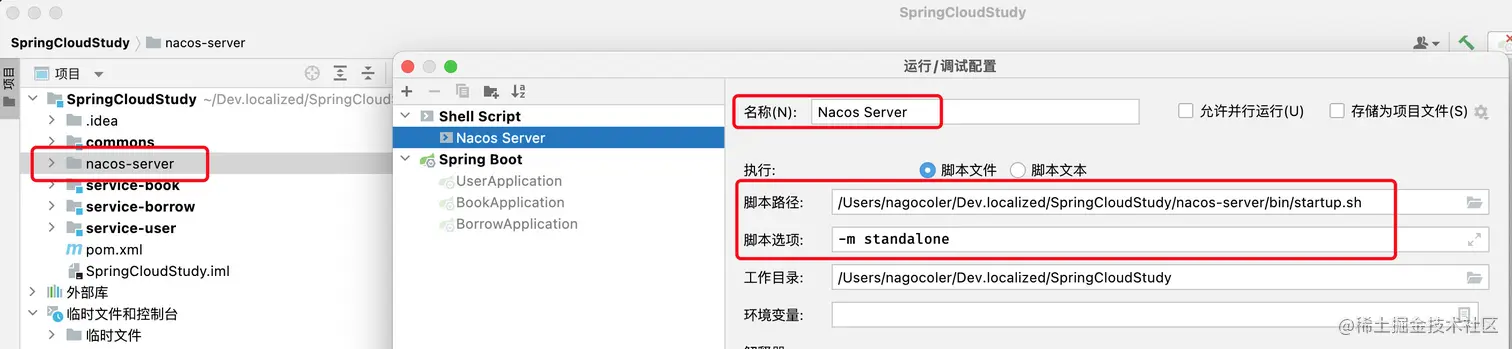 其中-m standalone表示单节点模式,Mac和Linux下记得将解释器设定为/bin/bash,由于Nacos在Mac/Linux默认是后台启动模式,我们修改一下它的bash文件,让它变成前台启动,这样IDEA关闭了Nacos就自动关闭了,否则开发环境下很容易忘记关: