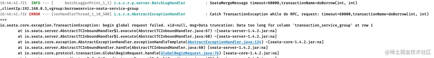 如果Seata服务端出现报错,可能是我们自定义事务组的名称太长了: