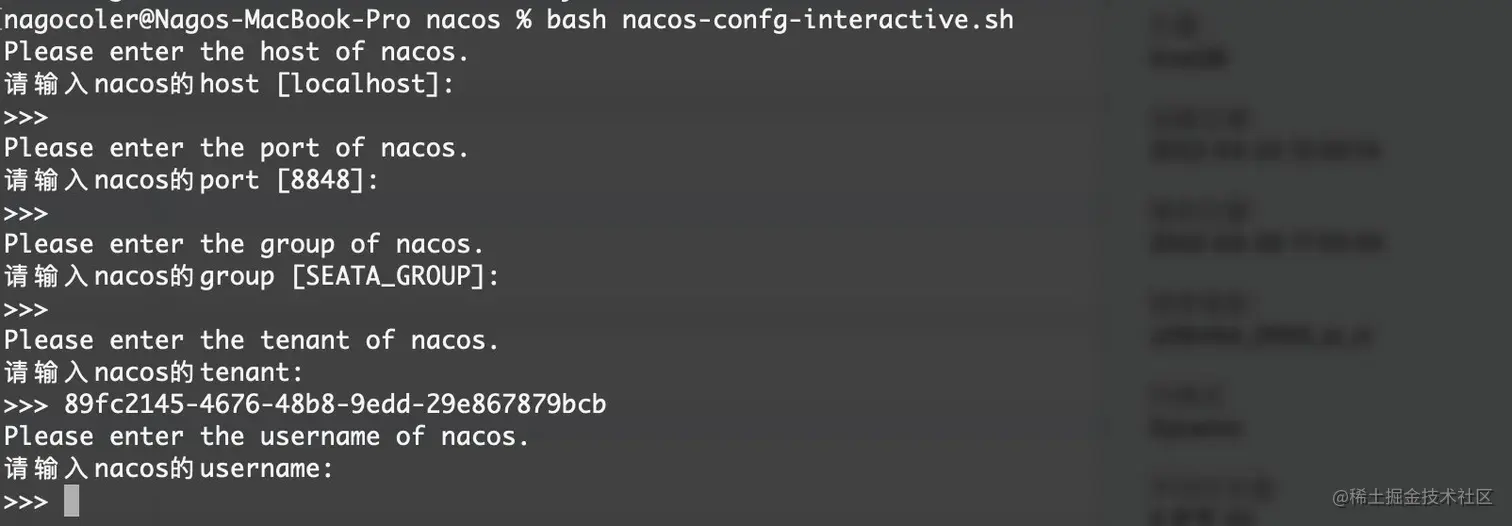 接着,我们需要将配置导入到Nacos中,我们打开一开始下载的源码script/config-center/nacos目录,这是官方提供的上传脚本,我们直接运行即可(windows下没对应的bat就很蛋疼,可以使用git命令行来运行一下),这里我们使用这个可交互的版本: