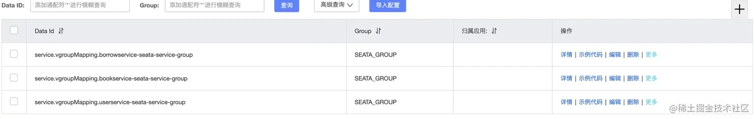 注意,还没完,我们还需要将对应的事务组映射配置也添加上,DataId格式为service.vgroupMapping.事务组名称,比如我们就使用默认的名称,值全部依然使用default即可: