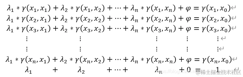 其中,A代表在原有变异函数矩阵中额外添加全1行与全1列(交界处1换为0)后的矩阵,λ代表各权重组成的列向量,φ代表前述分析引入的拉格朗日乘子,B为各位置与待求解位置对应距离的变异函数值组成的列向量,且在列尾增加一个1。