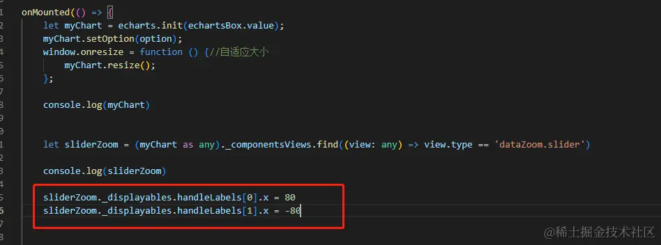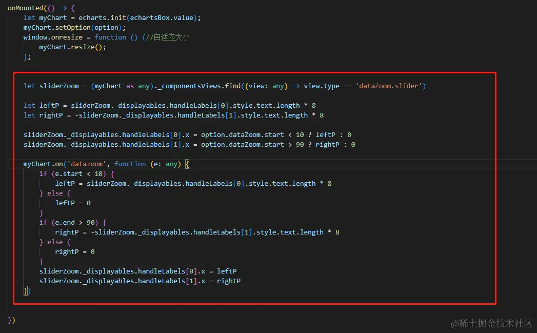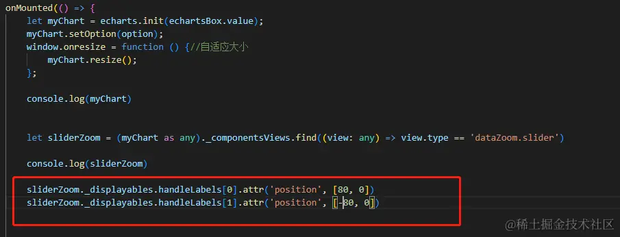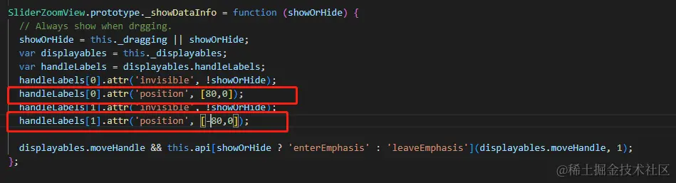 后面去看了echarts的源码,找到了dataZoom组件中控制两侧文本样式的代码(node_modules\echarts\lib\component\dataZoom\SliderZoomView.js),经过仔细查找以及在浏览器上进行断点测试,发现左右文本的属性是存放在_displayables上的。