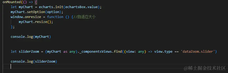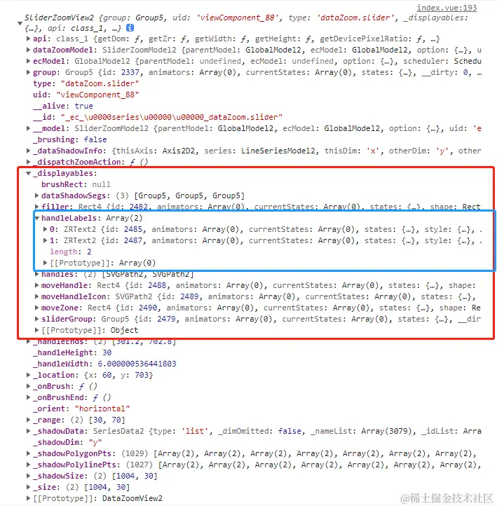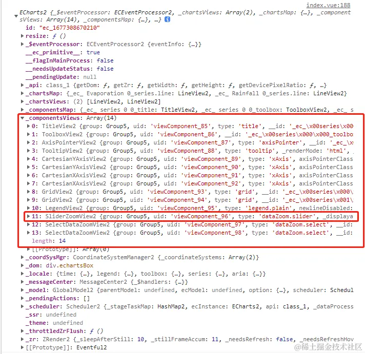 但是不可能通过改源码的方式来完成,因为别人拉代码下载的依赖还是原来的,于是去到封装的echarts组件中,打印了一下创建的ECharts对象,发现在它身上有个_componentsViews属性,并且其中有一项正好是SliderZoomView对象: