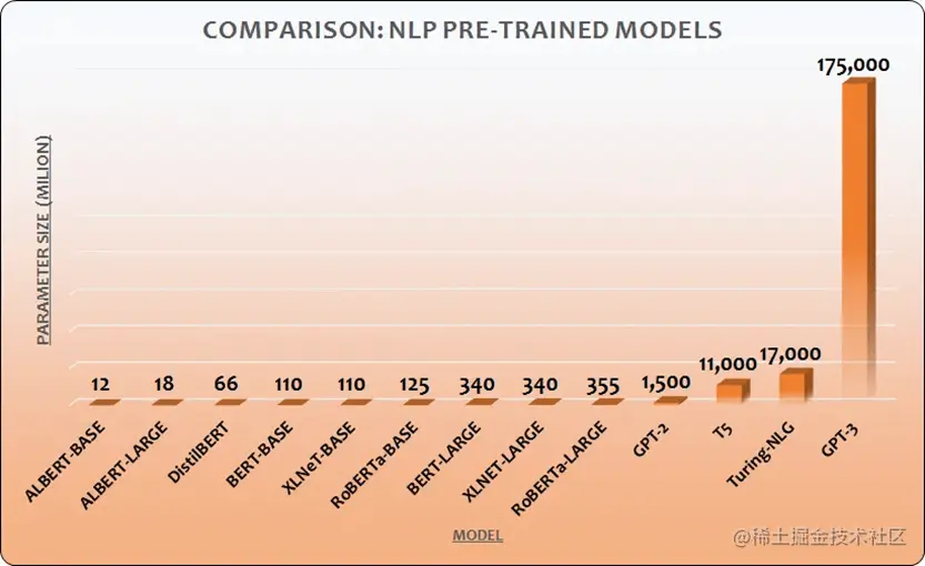 1750亿参数,这个参数大概意思是表示每个字/词出现的可能性。到底有多大,看下图就有个直观的感受。
