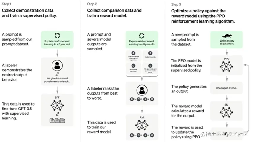 从工程上,我理解ChatGPT是GPT-3.5的一个优化应用。简单说,就是先人肉标注一些GPT-3.5返回数据,以教GPT-3.5说话,然后用强化学习的算法来持续评价,最终实现了这么个神奇的模型。(号称用到了40+的人力来持续教AI做事,据说还有肯尼亚的低价劳工。)