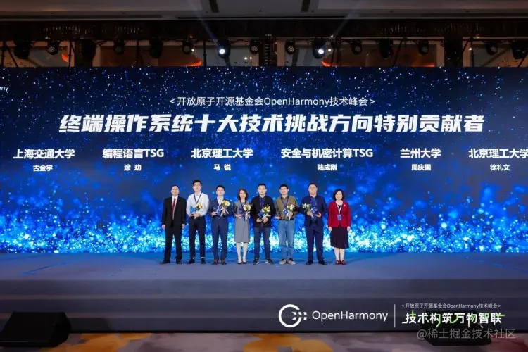 此外,技术峰会现场还发布了OpenHarmony高校技术俱乐部星光计划,并对参与该计划的12所高校授予了纪念证书,以对他们繁荣OpenHarmony学术生态所做出的贡献进行致谢。最后技术峰会还对参与终端操作系统十大技术挑战方向,并作出特殊贡献的学术界、产业界和科技界代表进行了致谢。