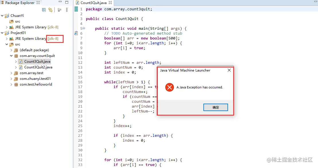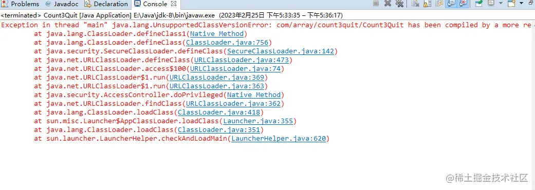 今天我将jdk11换成了jdk8,然后在eclipse里我发现无法运行之前写的代码,点击运行立马弹出来一个红色的异常框,点击确定后出现满屏红字。这是怎么回事?仔细看我发现第一个异常框上面写着Java Virtual Machine,也就是java的虚拟机,并且在终端出现的提示中看到了UnsupportedClassVersionError的提示,从字面上可以看出大概是“未得到支持的类版本错误”的意思。