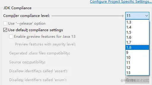 首先这个错误肯定是因为我更换了jdk的版本导致的,所以我尝试把代码内容复制了一份重新编译运行,结果还是报错。我开始思考因为java是先通过编译成.class文件再到JRE运行的,可能是编译和运行两个环节中有不一致导致的,只不过IDE中编译和运行的过程合二为一了,我们很容易忽略这中间的过程。所以我找到eclipse里面编译的相关设置,发现编译时所用的还是jdk11编译,这样编译后的程序不能在jdk8的JRE中运行也就说得通了。