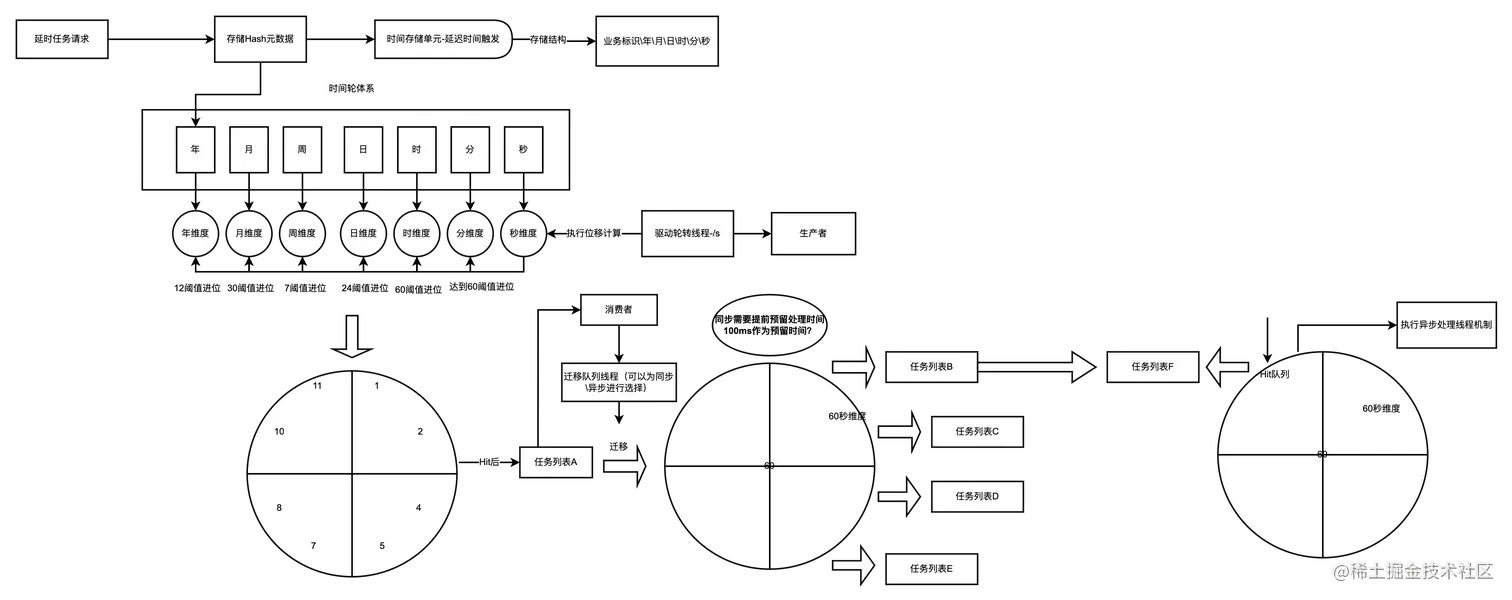 如果任务按照分钟级别来定时执行,那么当分钟时间轮达到对应刻度时,就会将任务交给异步线程来处理,然后将任务再次注册到秒级别的时钟轮上。