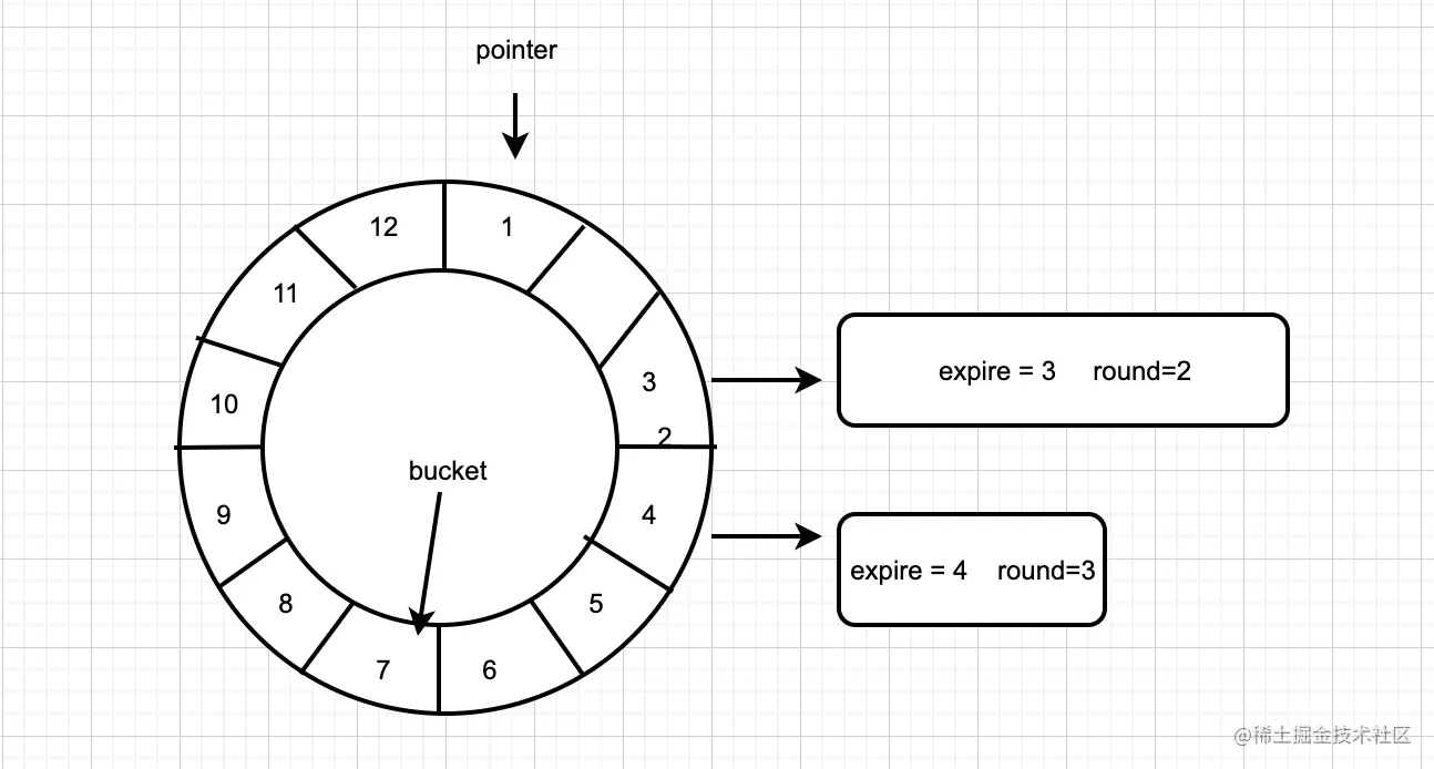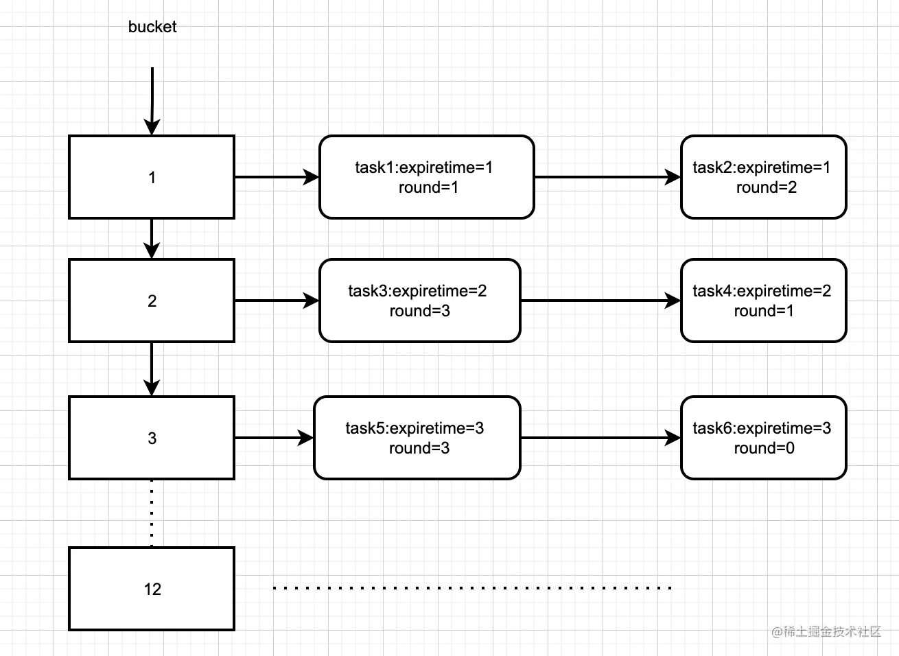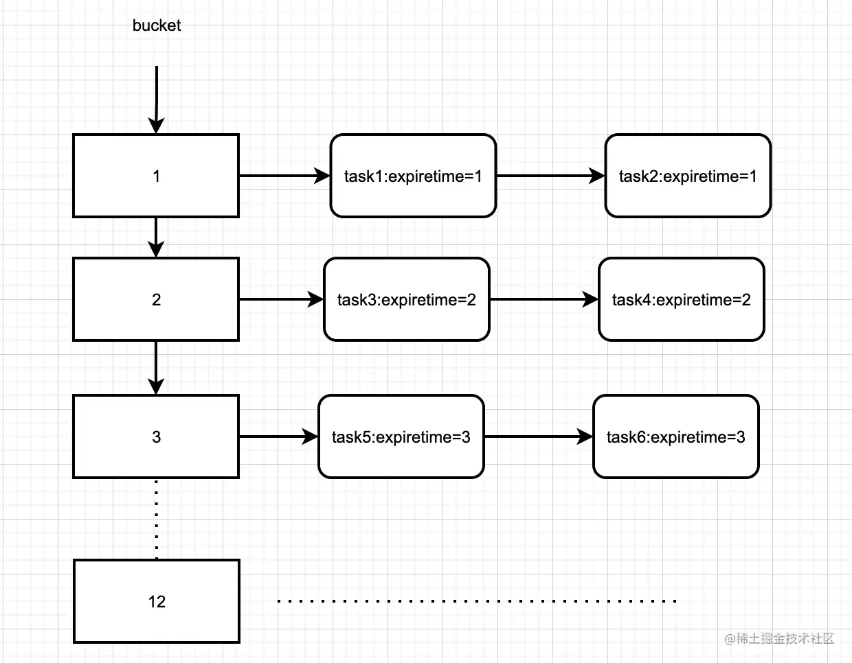 bucket : 时间轮由bucket组成,如上图,有12个bucket。每个bucket都挂载了未来要到期的节点(即: 定时任务/延时任务)。