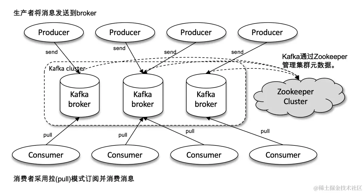 Kafka体系架构包括Producer(消息发送方,将消息发送到Broker)、Broker(服务代理节点,可看作一个独立的服务节点或服务实例,负责将收到的消息存储到磁盘)、Consumer(消息接收方,采用拉(pull)模式从Broker订阅并消费消息)以及一个唯一的ZooKeeper集群(负责群元数据的管理、控制器的选举等),如下图2-1所示。