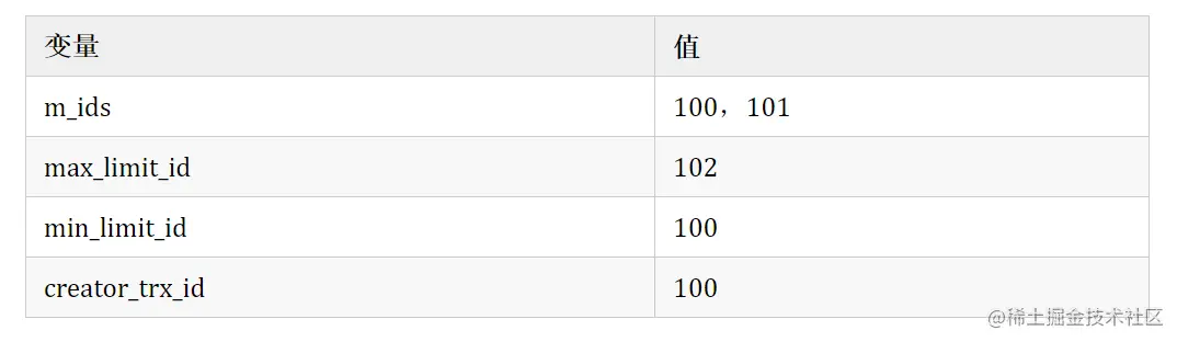min_limit_id(100)=<trx_id(101)<max_limit_id(102);