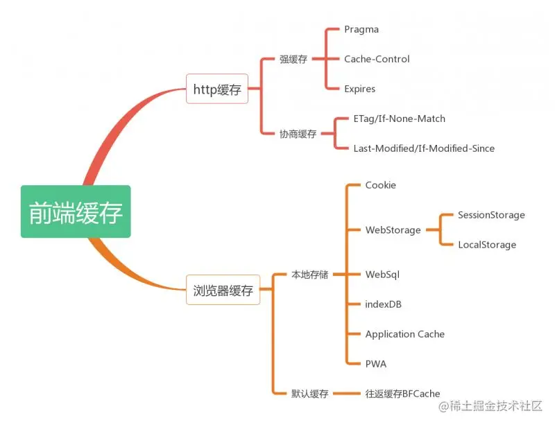 前端缓存可分为两大类:http缓存和浏览器缓存。我们今天重点讲的是http缓存,所以关于浏览器缓存大家自行去查阅。下面这张图是前端缓存的一个大致知识点: