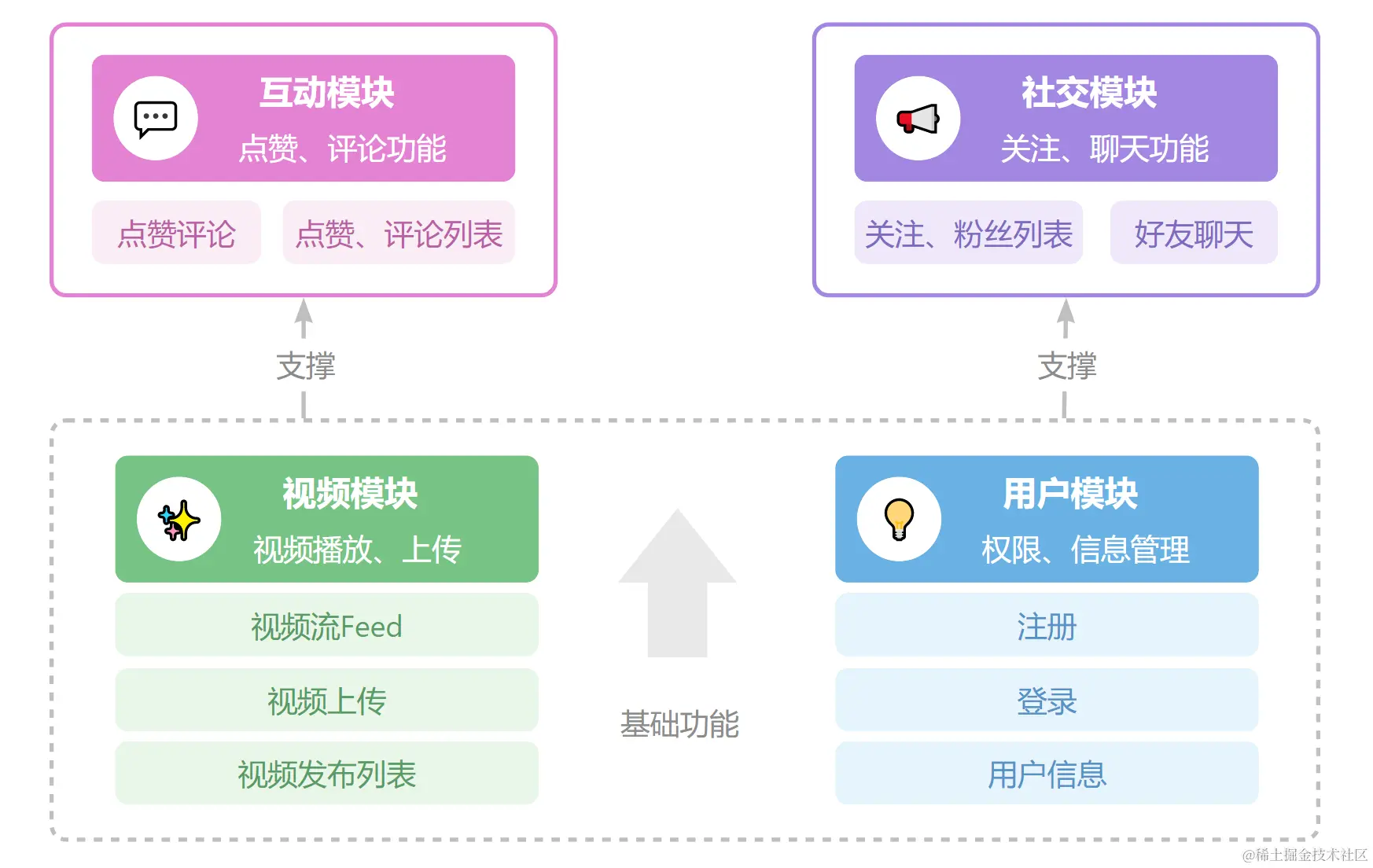 基础功能有:视频模块、用户模块
