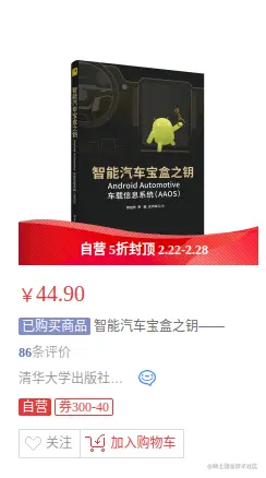 啧啧,我在京东购买的时候明明60多,现在已经5折促销了,从这稍显一般的销量也能看出本书的含金量确实还有待提高,不过即便如此,本书也是市面上唯一一本能够系统性地讲解车载Android系统的书了,而且书写风格非常值得我个人学习。