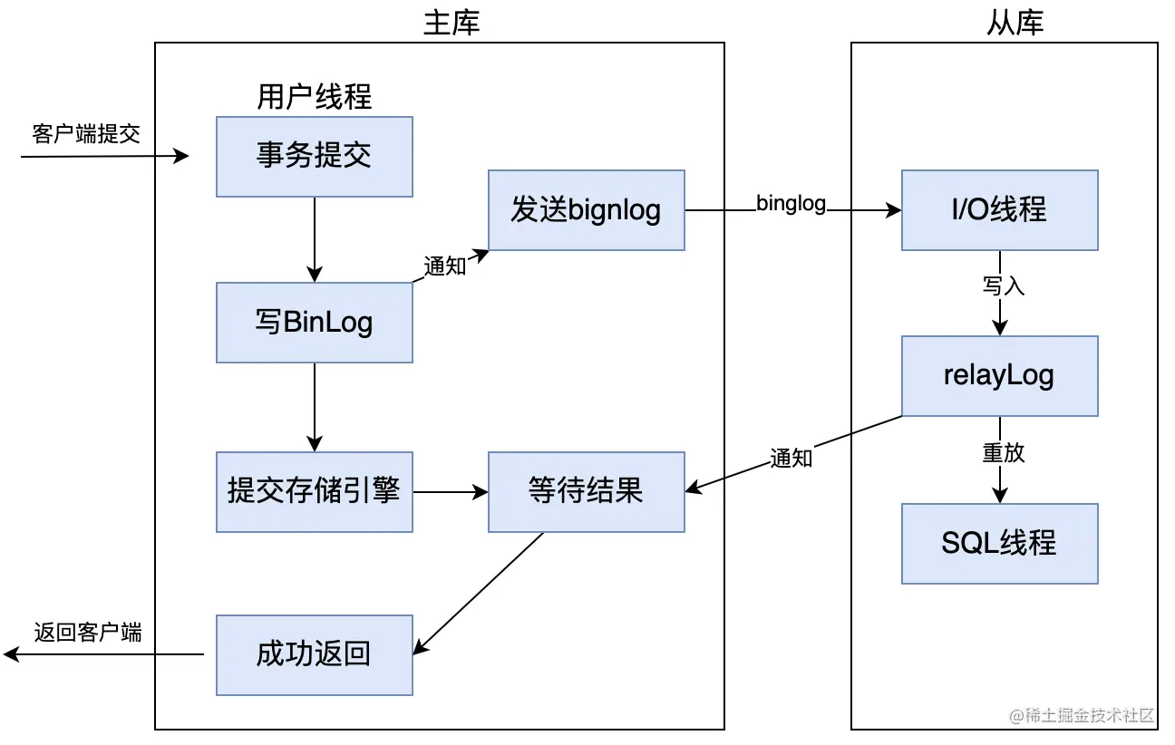 而异步复制,就是当主库提交事物后,会通知binlog dump线程发送binlog日志给从库,一旦binlog dump线程将binlog日志发送给从库之后,不需要等到从库也同步完成事务,主库就会将处理结果返回给客户端。