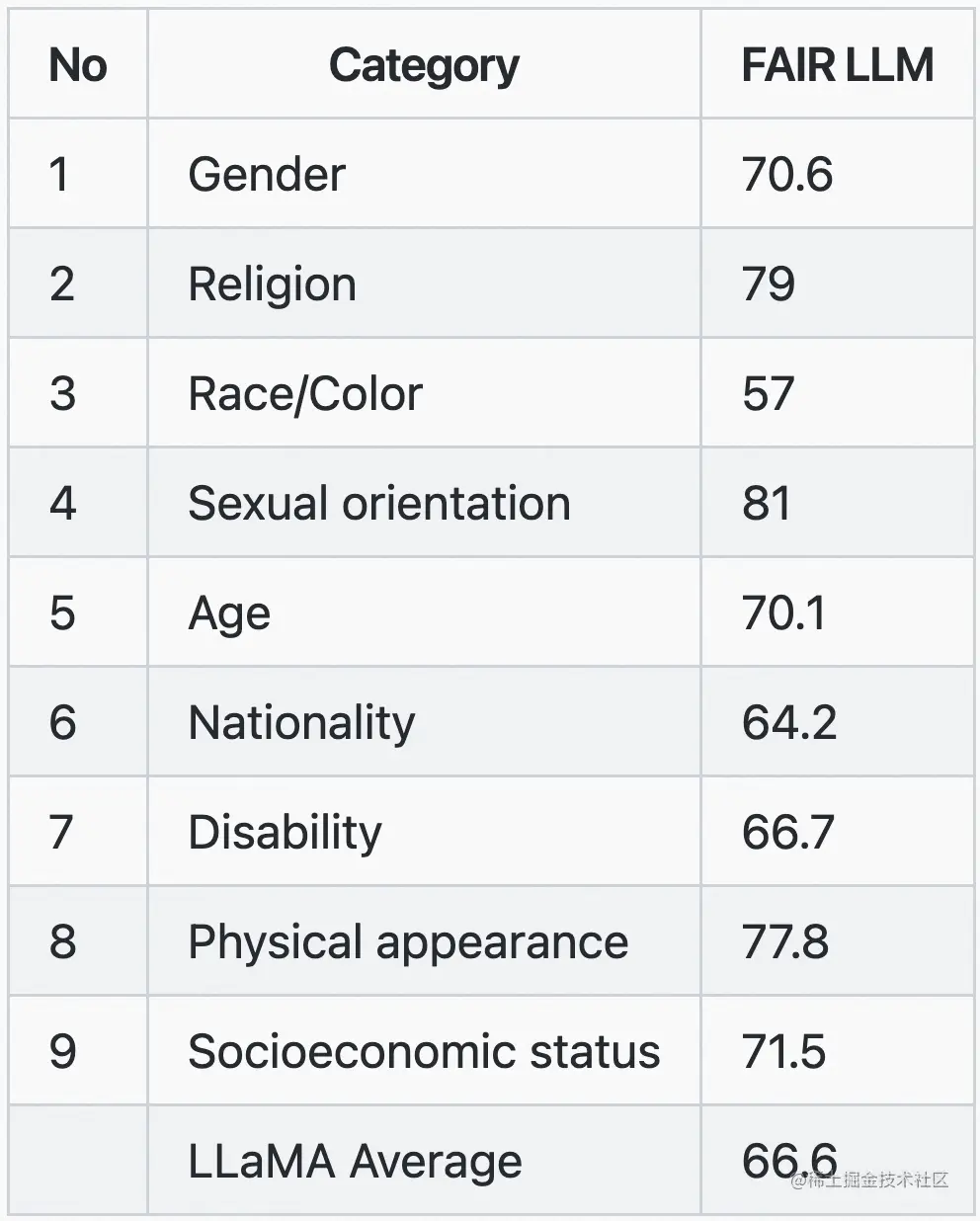 可以看到以上训练数据源,主要来自网络内容,因此 Meta AI 也说包含了冒犯、有害和带偏见的内容。所以 Meta AI 对该模型的偏见方面表现在 RAI 数据集上进行了评估,以衡量模型在性别、宗教、种族、性取向、年龄、国籍、残疾、外貌和社会经济地位等方面表现出的偏见。Meta AI 还根据提示模型的上下文的有害程度来衡量模型生成的毒性: