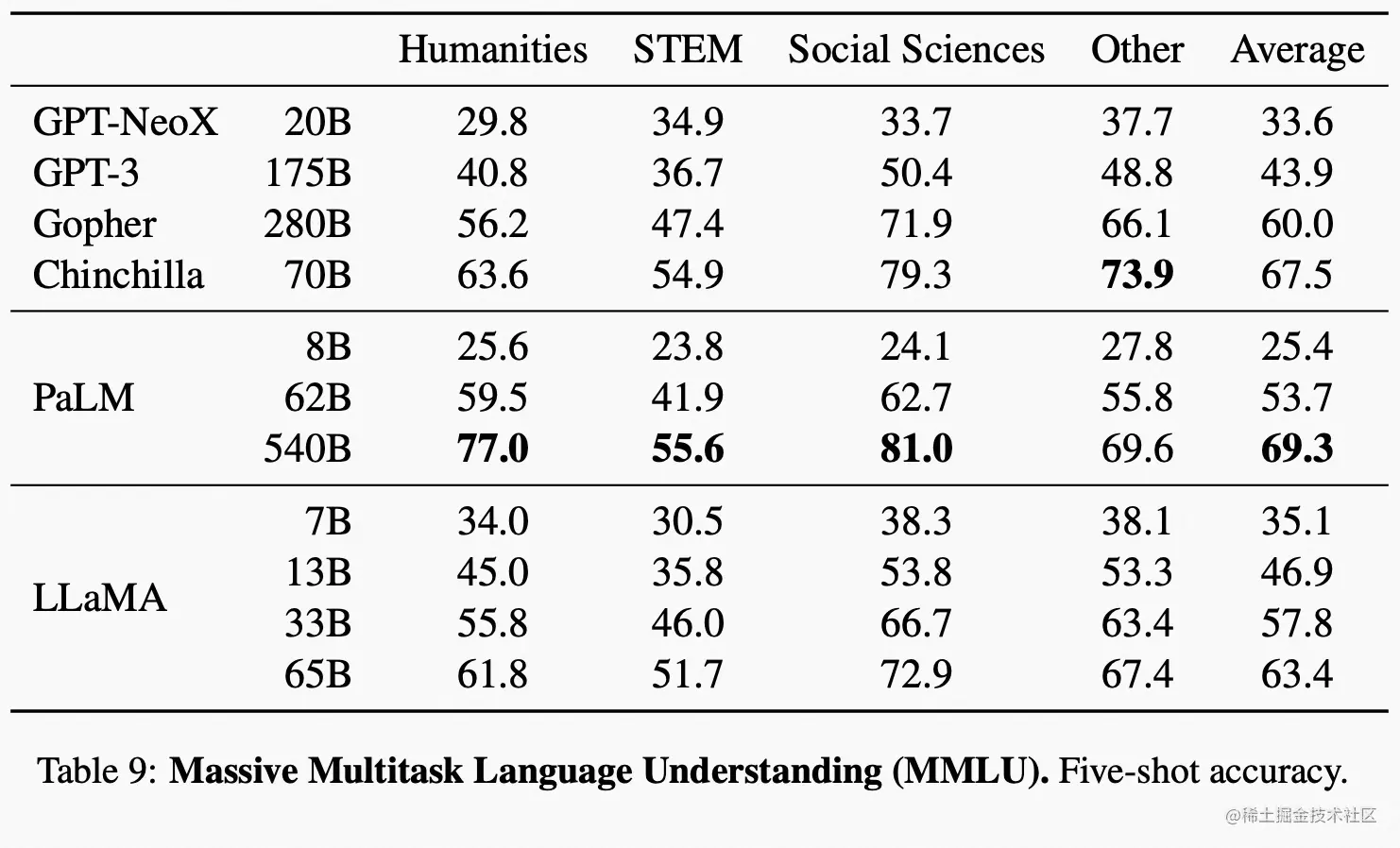 大规模多任务语言理解(MMLU)的表现对比如下,论文的附录 B 中 Table 16 中有完整的各模型表现,大家可以去查看。