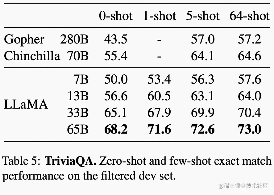 在 TriviaQA 上 Zero-shot、few-shot 对比问答效果的表现: