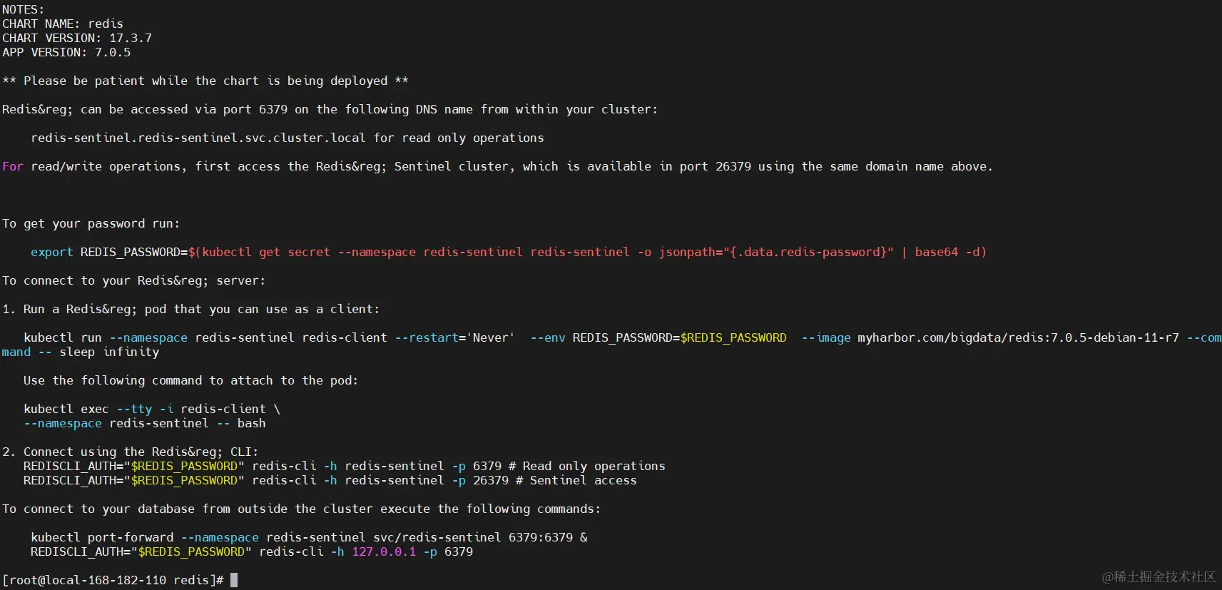 kubectl run --namespace redis-sentinel redis-client --restart='Never' --env REDIS_PASSWORD=$REDIS_PASSWORD --image myharbor.com/bigdata/redis:7.0.5-debian-11-r7 --command -- sleep infinity