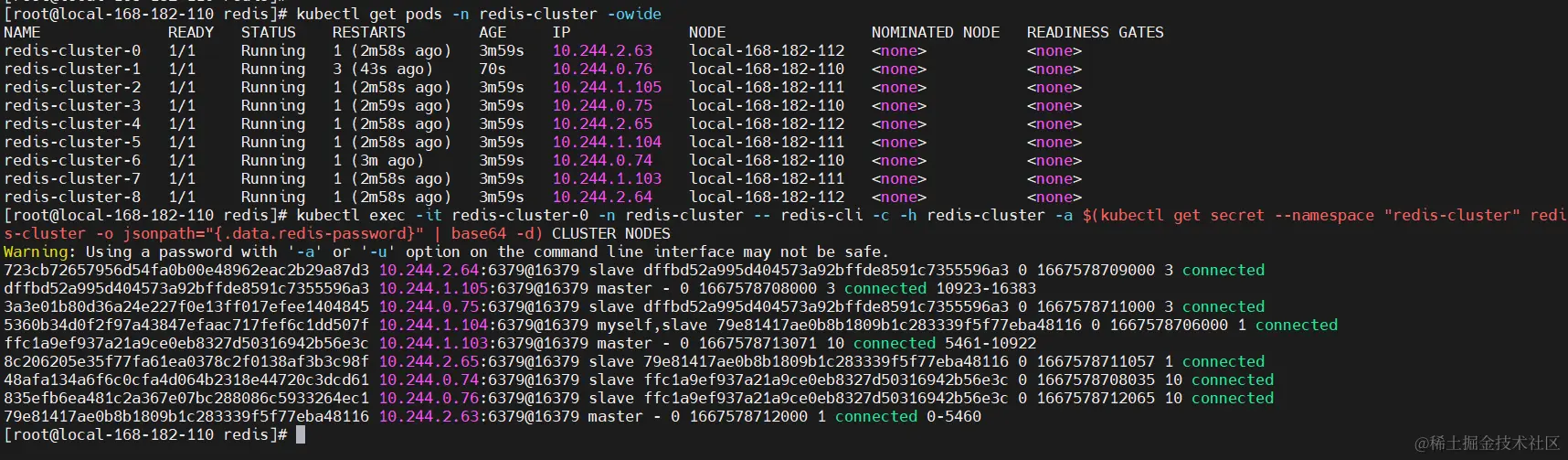 kubectl exec -it redis-cluster-0 -n redis-cluster -- redis-cli -c -h redis-cluster -a $(kubectl get secret --namespace "redis-cluster" redis-cluster -o jsonpath="{.data.redis-password}" | base64 -d) CLUSTER NODES