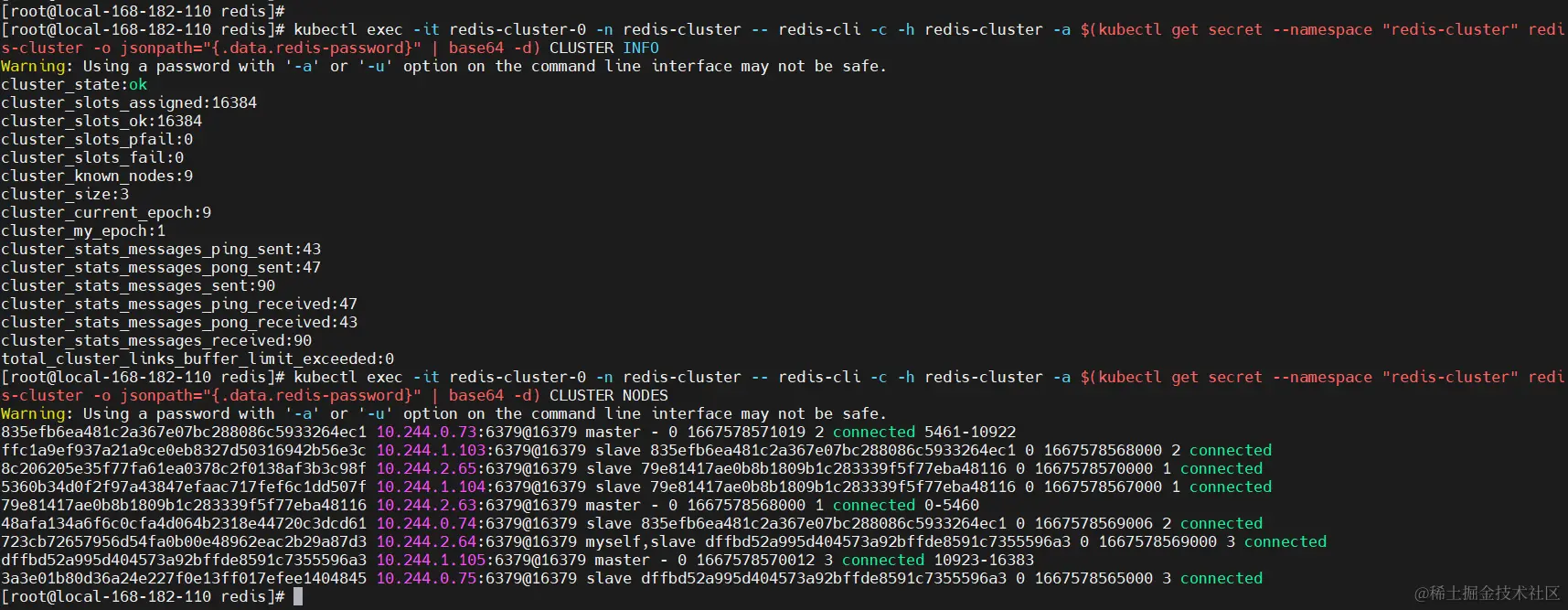 kubectl exec -it redis-cluster-0 -n redis-cluster -- redis-cli -c -h redis-cluster -a $(kubectl get secret --namespace "redis-cluster" redis-cluster -o jsonpath="{.data.redis-password}" | base64 -d) CLUSTER INFO