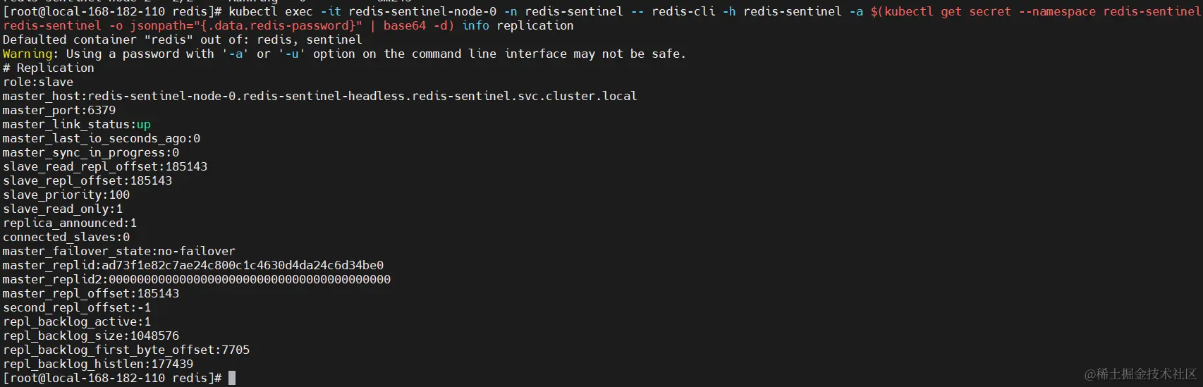 kubectl exec -it redis-sentinel-node-0 -n redis-sentinel -- redis-cli -h redis-sentinel -a $(kubectl get secret --namespace redis-sentinel redis-sentinel -o jsonpath="{.data.redis-password}" | base64 -d) info replication