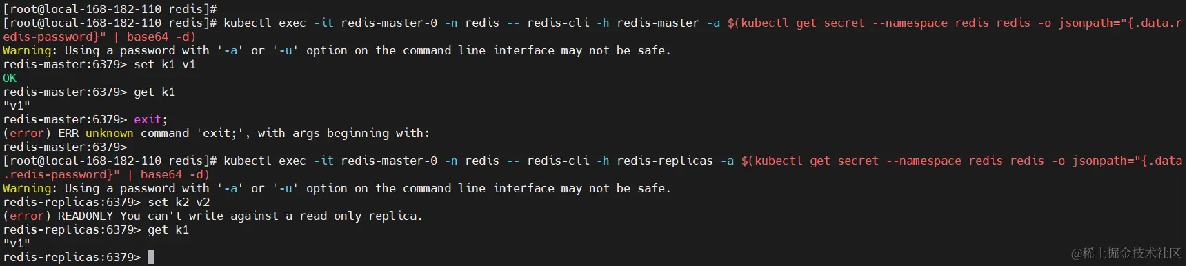 REDISCLI_AUTH="$REDIS_PASSWORD" redis-cli -h redis-sentinel -p 6379 # Read only operations