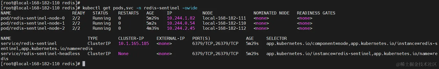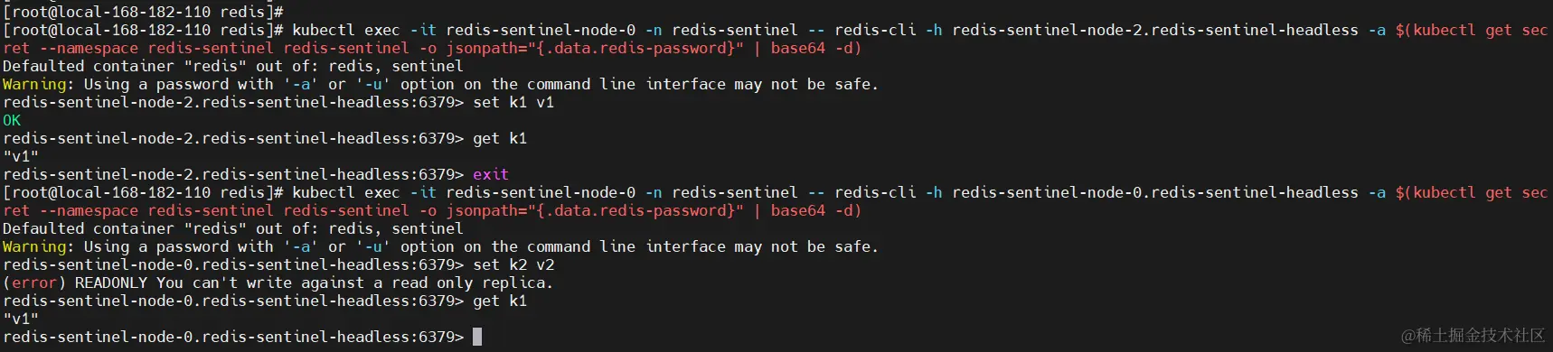 kubectl exec -it redis-sentinel-node-0 -n redis-sentinel -- redis-cli -h redis-sentinel-node-0.redis-sentinel-headless -a $(kubectl get secret --namespace redis-sentinel redis-sentinel -o jsonpath="{.data.redis-password}" | base64 -d)