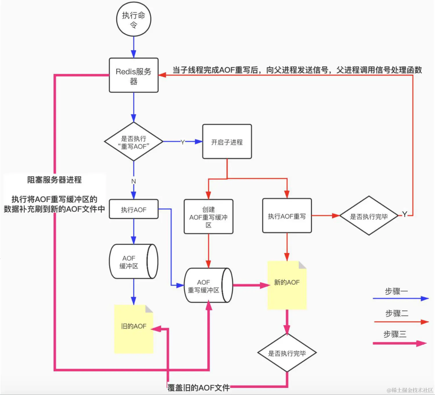 AOF重写:主进程fork出一个子进程,子进程创建出aof重写缓冲区,并执行aof重写, 当一个 redis 命令被服务进程接收且需要被执行时,除了执行这个命令之外,同时还会将这个命令发送给 AOF 缓冲区和 AOF 重写缓冲区。 当子进程完成 AOF 重写后,它会向父进程发送一个信号,要求父进程调用一个信号处理函数: 首先阻塞主服务进程,将 AOF 重写缓冲区的内容写入到新的 AOF 文件中。 其次新的 AOF 覆盖旧的 AOF。 最后恢复主服务进程,可以继续接收并执行 redis 命令。