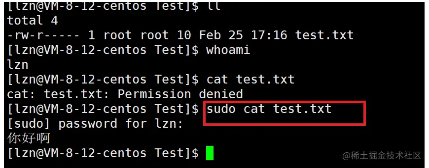 此时该用户lzn便可以使用sudo对指令进行提权了。输入sudo的时候,会提示输入用户密码,密码确认后就会实现指令提权。