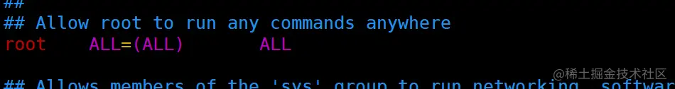 1、使用root身份,输入vim/etc/sudoers,(必须使用root身份)找到如下所示: