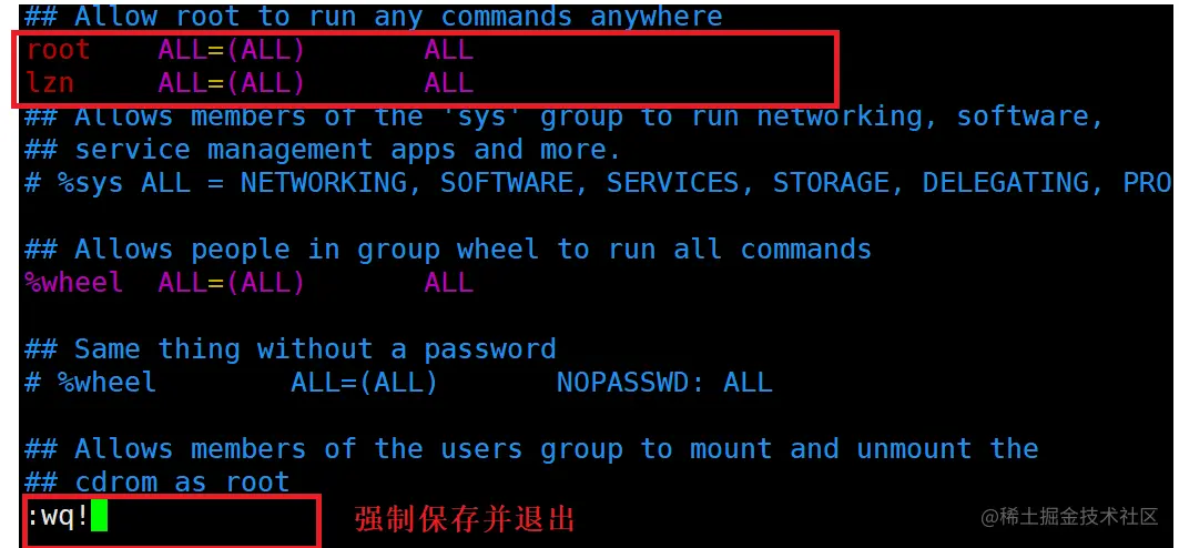 2、将我们的用户按照它的格式,添加进去保存并退出(这里需要强制保存并退出!)。